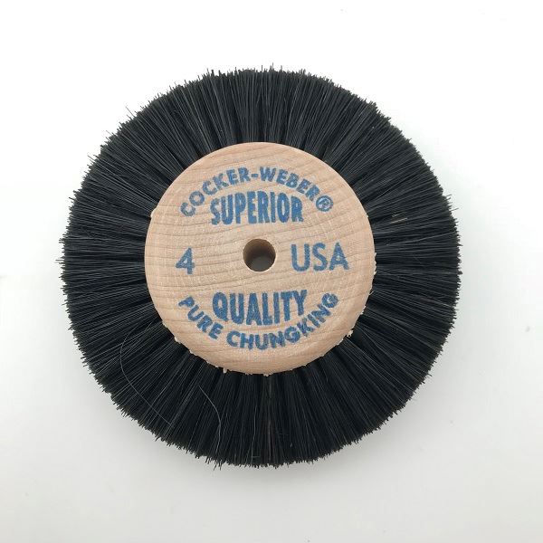 Cocker Weber brush with wood center. This brush is the highest quality produced by one of the most respected polish brush manufacturers. The pure chunking bristles will remain tightly packed into the hard maple wood hub. Attach to spindle on a motor and use these brushes for a first buff. Apply a buffing compound (720001) to polish away firescale and scratches.