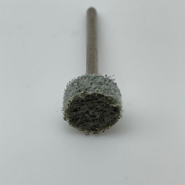 Compact abrasive lightly deburrs and finishes the workpiece without changing part geometry. Mounted point is securely fastened to a metal spindle for safe use with die grinders. Non-woven construction resists loading during use. Unitized production method compresses abrasive web for greater density and durability.