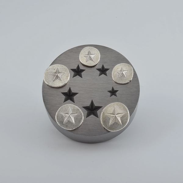 This stamp is made from hardened and tempered tool steel. These are fabricated/handmade, each may have a slight difference.