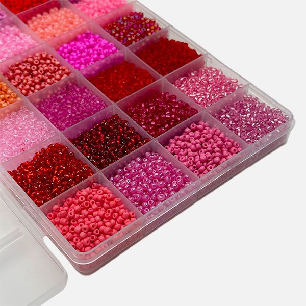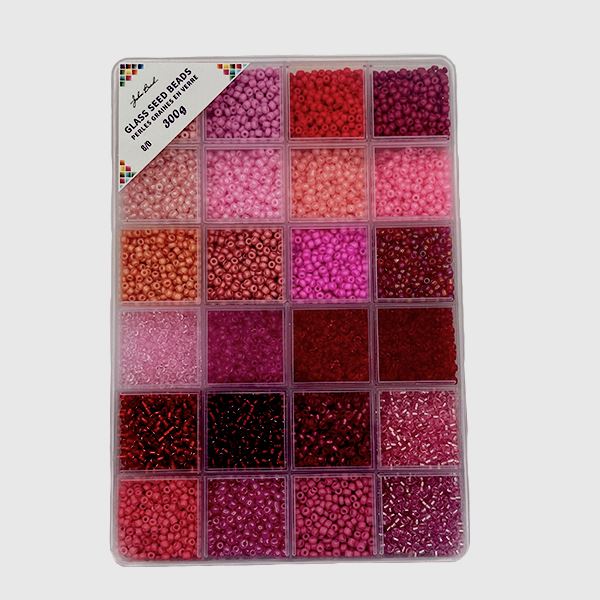 24 Assorted shades of pink and red glass 8/0 seed beads. Approximately 300 grams.