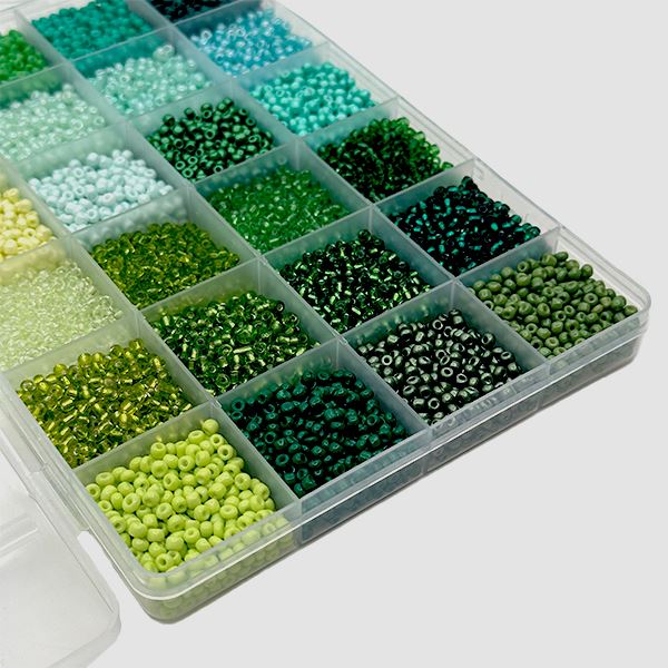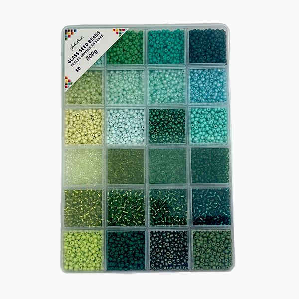 24 Assorted shades of green glass 8/0 seed beads. Approximately 300 grams.