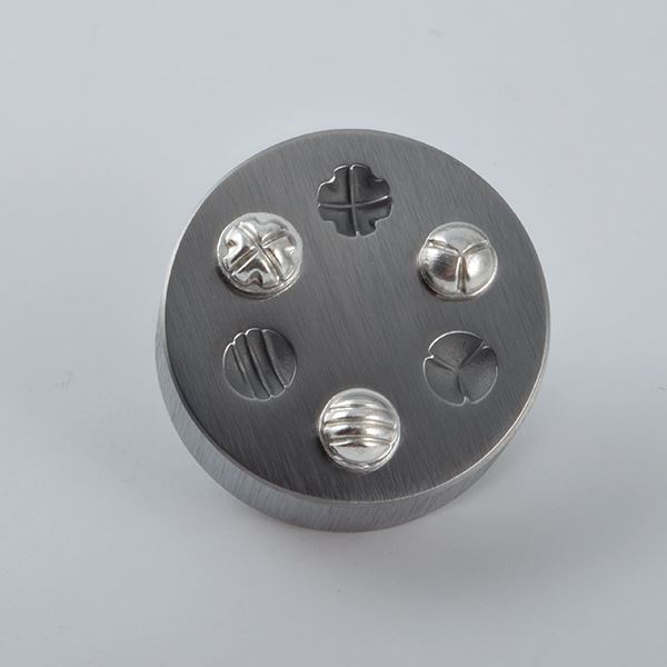 This stamp is made from hardened and tempered tool steel. These are fabricated/handmade, each may have a slight difference.