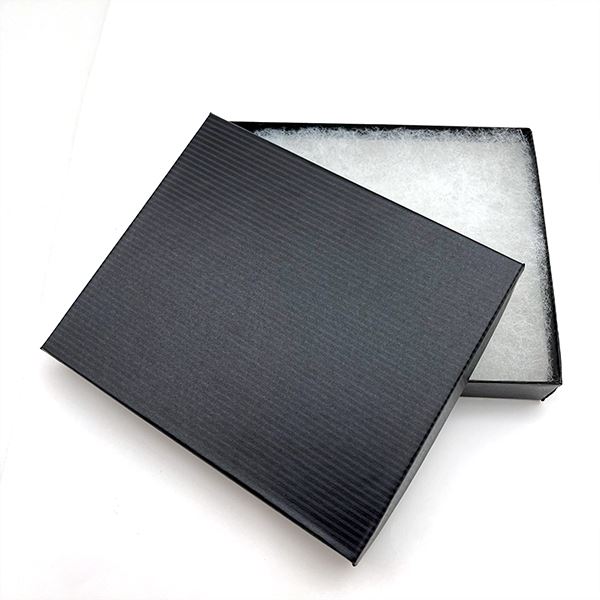 This black pin stripe cardboard gift box comes in two parts, a base and lid, and contains a cottony batting to cushion and protect the contents. This box measures 5 inches wide by 6 inches long and 1 inch tall. These are great gift boxes for any occasion.