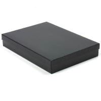 This black pin stripe cardboard gift box comes in two parts, a base and lid, and contains a cottony batting to cushion and protect the contents. This box measures 8 inches wide by 5 1/2 inches long and 1 1/4 inches tall. These are great gift boxes for any occasion.