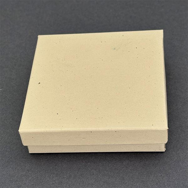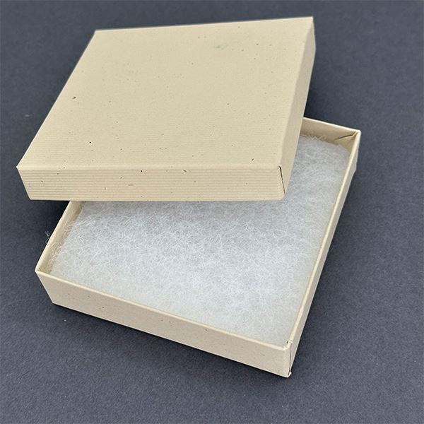 This oatmeal cardboard gift box comes in two parts, a base and lid, and contains a cottony batting to cushion and protect the contents. This box measures 3-1/2 inches wide by 3-1/2 inches long and 1 inch tall. These are great gift boxes for any occasion.