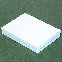 This white cardboard gift box comes in two parts, a base and lid, and contains a cottony batting to cushion and protect the contents. This box measures 8 inches wide by 5 1/2 inches long and 1 1/4 inches tall. These are great gift boxes for any occasion.