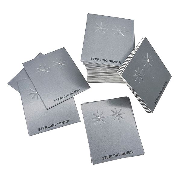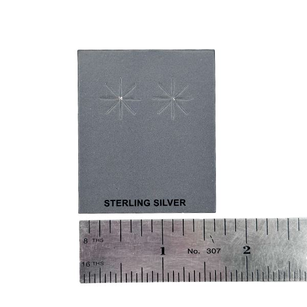 Cut from heavy grey card stock, these earring cards are printed sterling silver great for mounting different types of earrings. 1 5/8" x 2", star cut.