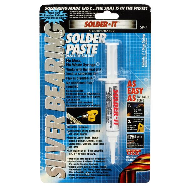 No mess, no waste syringe. Works with the heat of a torch or soldering iron. Flux is blended in. No additional flux required. Repairs copper, brass, bronze, nickel, platinum, chrome, monel, coated steel, cast iron, black steel and steel. Low melting point - flows smoothly at 430 degrees F, re-melts at 650 degrees F.