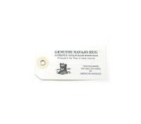 Durable white fiber material with metal reinforced hole. Front denotes item is genuine and authentic. Back has space for weaver's name, age, area, rug size, rug number, and price.