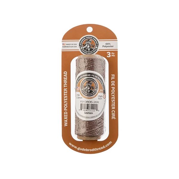 Thread is made of fiber and polyester. It holds a round shape, the sizing is 0.38 millimeters.